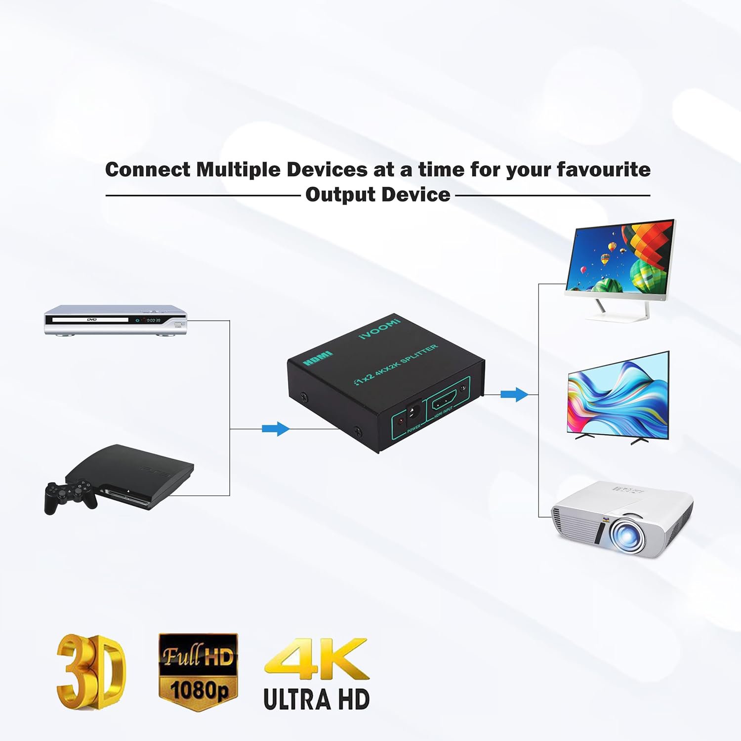 iVOOMi 4K HDMI 2 Port Splitter | 1in2 Out – 1 Port to 2 Display Duplicate/Mirror – Supports 4Kx2K@30Hz 1080P 3D 3840 2160 for Xbox PS4 Sky Box | DVD Player | Power Adapter Inlcuded | 1 year Warranty